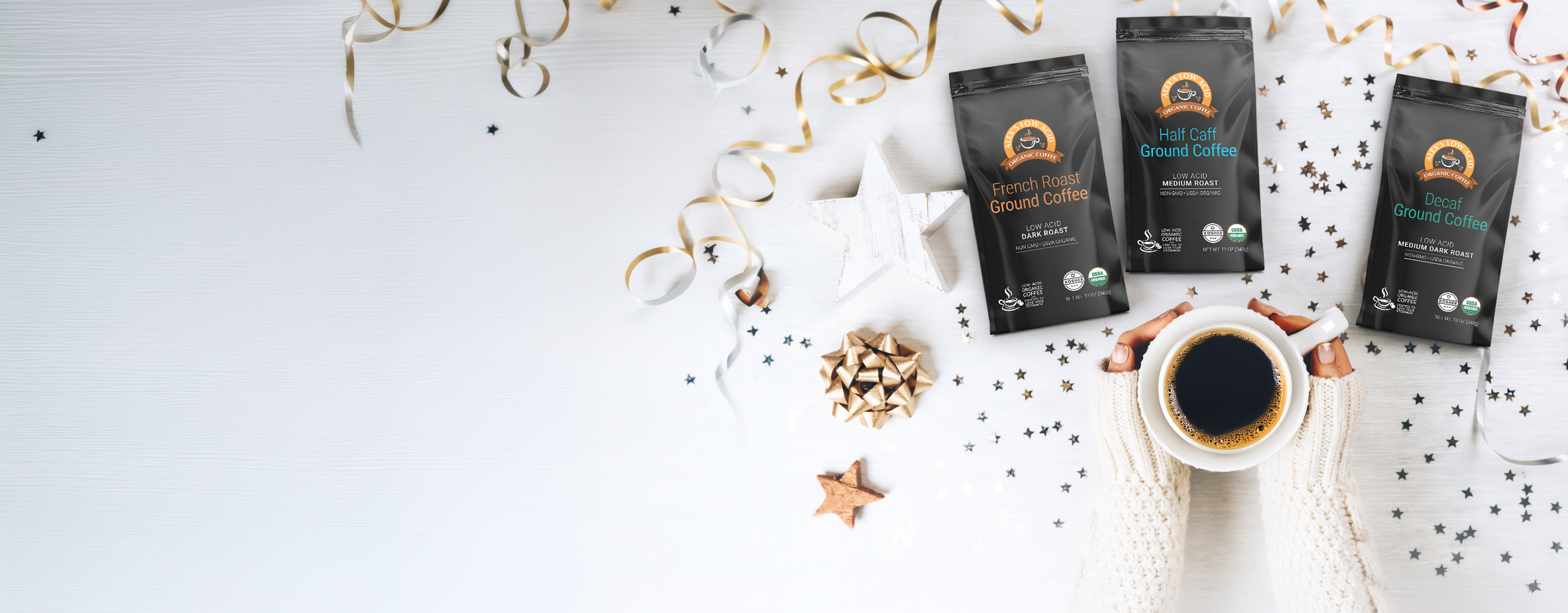 Alex's Low-Acid Organic Coffee™ - Half Caff Fresh Ground (12oz)